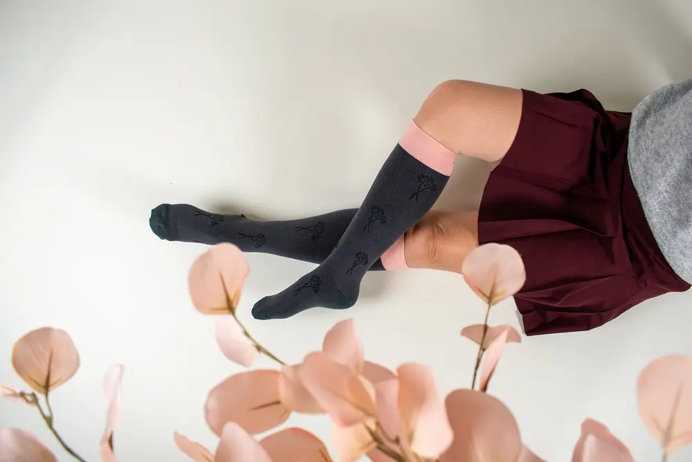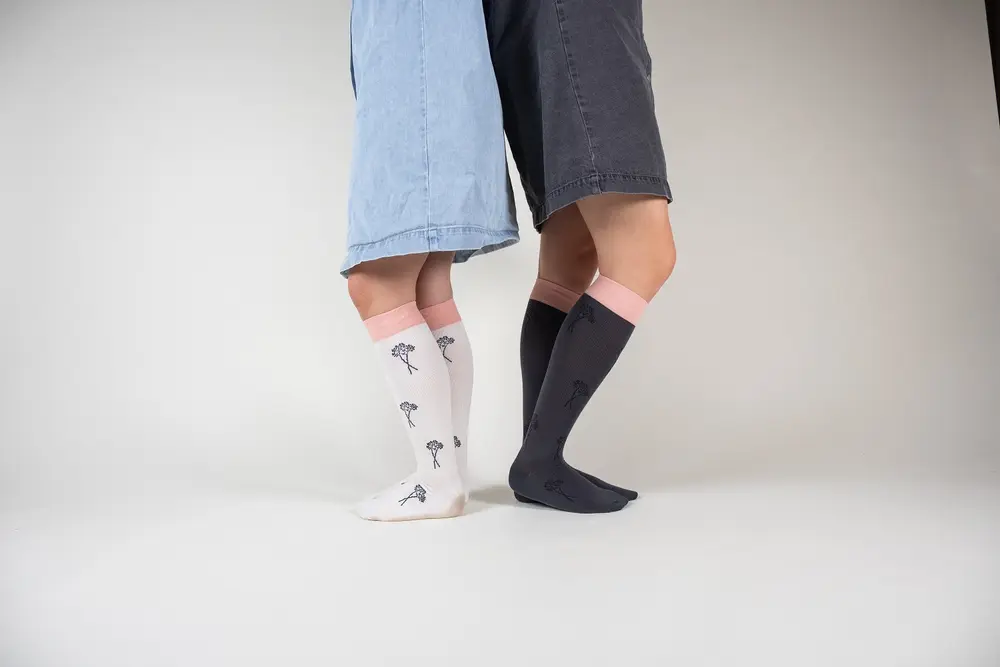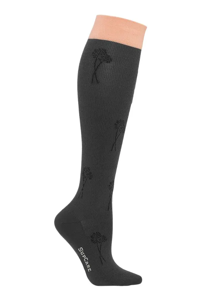 Deze romantische crème-witte compressiekousen met subtiele vergeet-mij-nietjesprint en een koraalkleurige band van SupCare zijn een stijlvolle en functionele keuze. Dankzij de combinatie van katoen en wol voelen ze zacht aan en bieden ze een comfortabele ondersteuning. De lichte compressie helpt bij het verminderen van vermoeide benen en stimuleert een gezonde doorbloeding.
